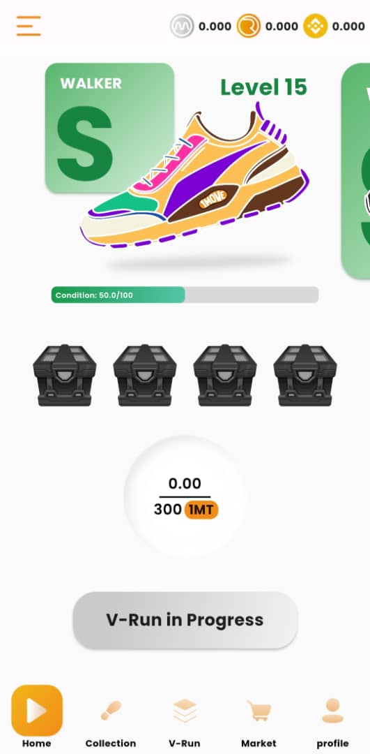 1Move Virtual running (V-Run) 代表了一种不同于普通 NFT 质押的方法，它完全专注于让用户受益。 1Move 允许对他们的 NFT 运动鞋进行质押，但采用与正常 NFT 质押不同的方法，重点是让用户充分受益。 在 1Move 的平台上，NFT 运动鞋可以在没有特定时间段的情况下处于 V-run 模式，用户可以继续享受这些运动鞋进行的活动的全部好处。 这些 NFT 被锁定在 1Move 的去中心化金融 (DeFi)/Move to Earn 平台中，以便在无需出售或失去其收藏所有权的情况下获得奖励。 在 V-run 模式下，NFT 将继续生成类似于处于活动状态的 NFT 的代币。